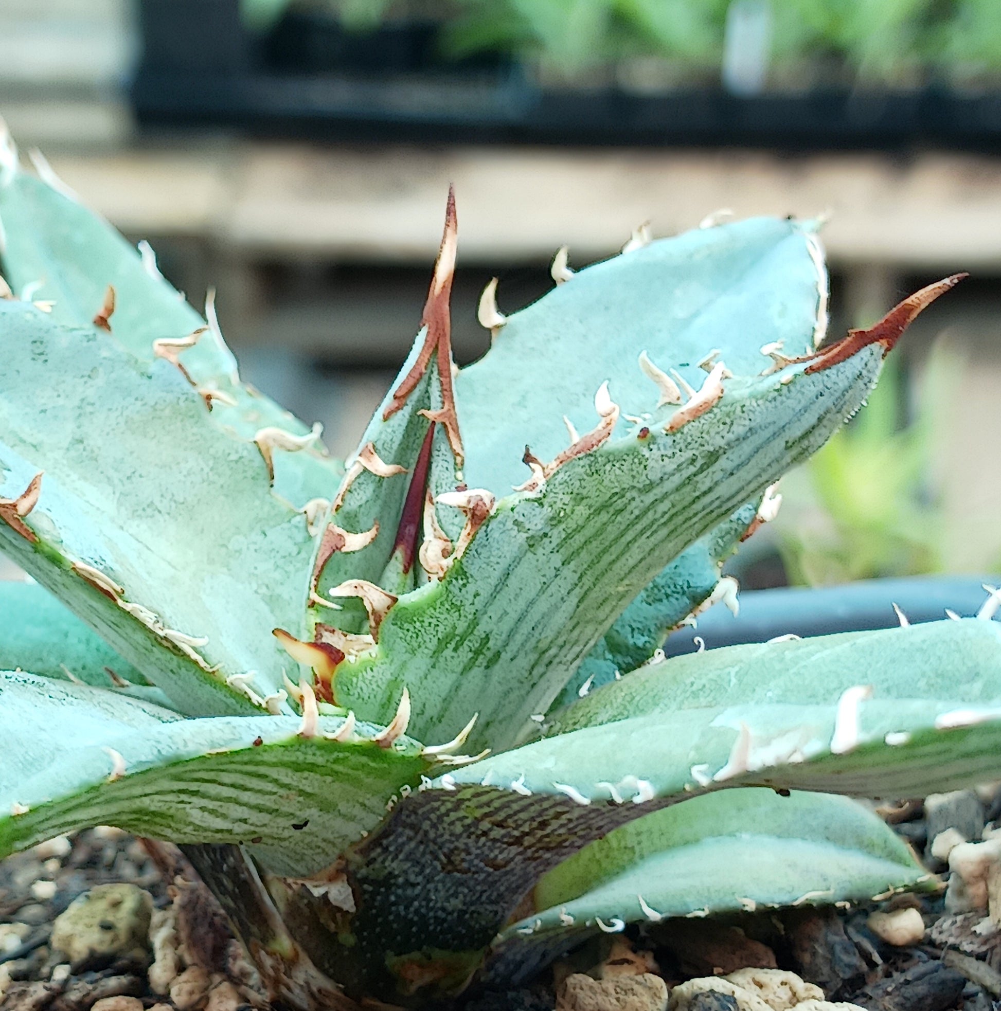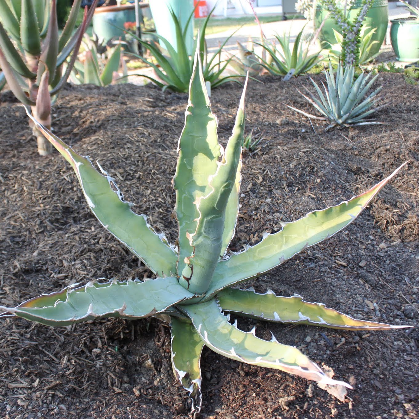 In a nod to one of Agave xylonocantha's most striking features it used to be named after the teeth of the Great White Shark! This Agave is also unique in that it forms relatively few of it's convoluted, sword-shaped leaves when compared to other agaves. It produces a basal rosette of up to 6 ft in diameter and 3 to 4 ft in height. Monocarpic flowering stalks can reach a height of 11 feet. It is a close relative of Agave lophantha.