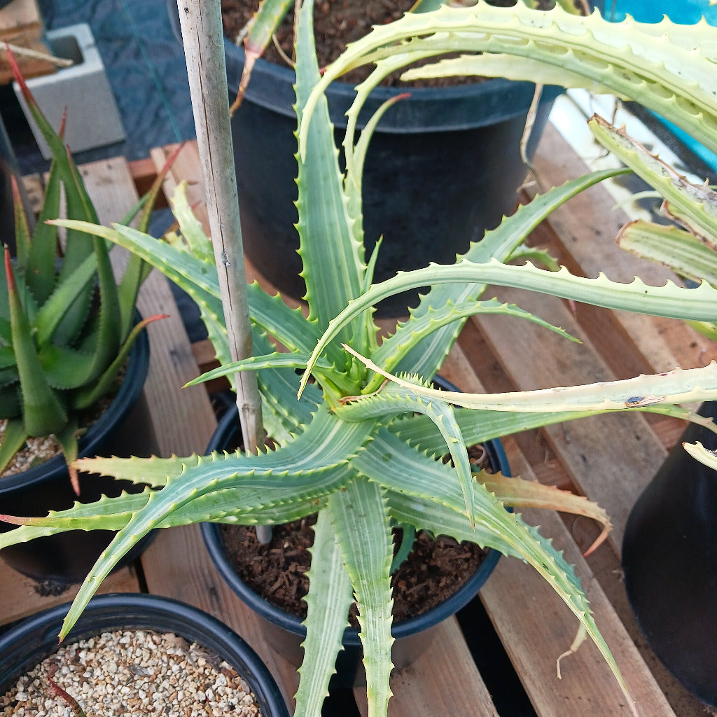 Known as the "Gilded Candelabra Aloe" or the "Striped African Torch Aloe." This popular cultivar of Aloe arborescens offers a unique twist on the classic succulent, characterized by its distinctive stripes.