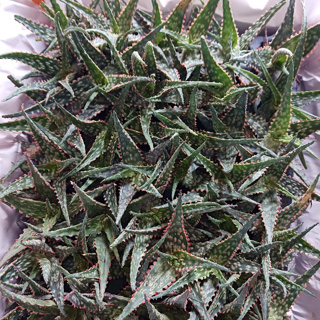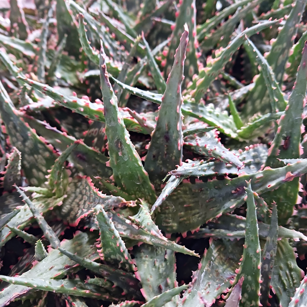 Aloe 'Carmine' is a compact, evergreen succulent hybrid valued for its colorful foliage and adaptability to both indoor and outdoor environments. Growing 6 to 10 inches tall and 8 to 12 inches wide, it forms slow-growing rosettes with fleshy, pale green leaves accented by orange stippling and bright orange-red fringed margins. Depending on light and water conditions, the foliage may develop blue-green and red hues, with a glaucous texture adding to its ornamental appeal. Blooming throughout the year, it produces red and salmon-colored flowers that attract hummingbirds and beneficial insects. Developed for drought tolerance and ornamental use, its specific breeding history remains unclear. Thriving in full sun to dappled shade, it prefers well-draining, rocky soil and occasional watering, remaining dry in winter to prevent rot. Highly resistant to heat, deer, and rabbits, it is also tolerant of verticillium wilt. Hardy to USDA Zone 9b, it withstands temperatures down to 25–30°F but requires protection in colder climates. Its compact size and striking foliage make it ideal for rock gardens, xeriscapes, succulent collections, and container plantings, where its year-round blooms contribute seasonal interest.
