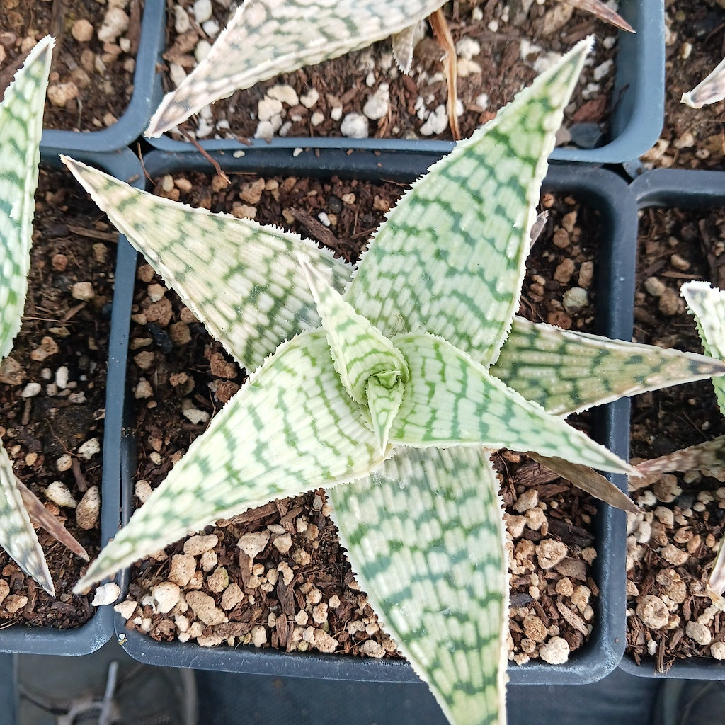 Aloe 'Delta Lights' is a hybrid succulent created by Kelly Griffin, using the genetics of Aloe deltoideodonta. Its compact rosettes reach up to 18 inches in height and 24 inches in width, showcasing dark green leaves adorned with creamy yellow to pale green zigzag patterns that may develop a pinkish blush under strong light. This plant produces offsets readily and blooms from fall through spring with dark reddish-orange tubular flowers on branched inflorescences, adding seasonal interest. Originally introduced in 2011, 'Delta Lights' gained popularity for its unique foliage but saw reduced production after 2022 due to sensitivity to prolonged wet conditions. Thriving in USDA zones 10a to 11b, it requires light shade or morning sun in hot inland areas, tolerates coastal sun, and needs well-draining soil to prevent root rot. Minimal watering is essential, particularly in winter, and it performs well in containers with proper drainage. Hardy to 25–30°F, it prefers regions with mild winters. Ideal for arid and Mediterranean-style gardens, 'Delta Lights' serves as a dramatic focal point in containers, rock gardens, or mixed plantings, offering year-round visual appeal and low-maintenance care.