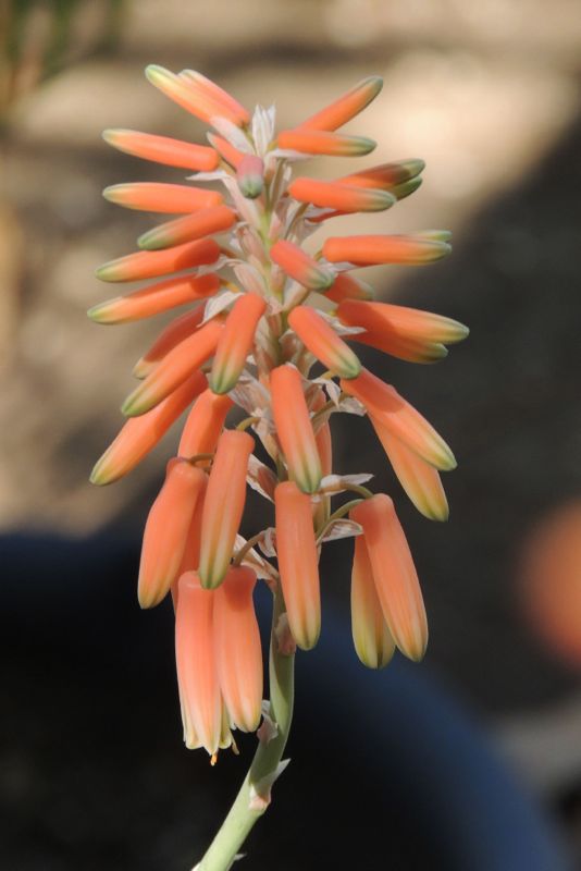 Aloe deltoideodonta, originating from southern central Madagascar, is a small, slow-growing, clustering Aloe with stunning, broad leaves adorned with longitudinal stripes and usually unbranched inflorescence. It produces pups from the base, forming rosettes with pale green leaves, about 6 to 8 inches long and 2 inches wide, featuring prominent darker-green parallel lines and straw-colored margins. The leaves are wedge-shaped, blue-green, and marked with faint lines, white spots, and a vaguely pink margin, gaining a reddish glow when stressed. This aggressive offsetter forms a small mound over time, clumping from the base. Flowering in mid to late fall, its unique salmon-colored flowers bloom early in the 'aloe season,' occasionally surprising with short-branched or unbranched conical inflorescences bearing green-tipped pale orange flowers that open to near white and deflex downward. Thriving in warm temperate climates, it withstands cold nights down to 25°F and adds charm to small to medium-sized containers or well-drained spots in dry gardens.