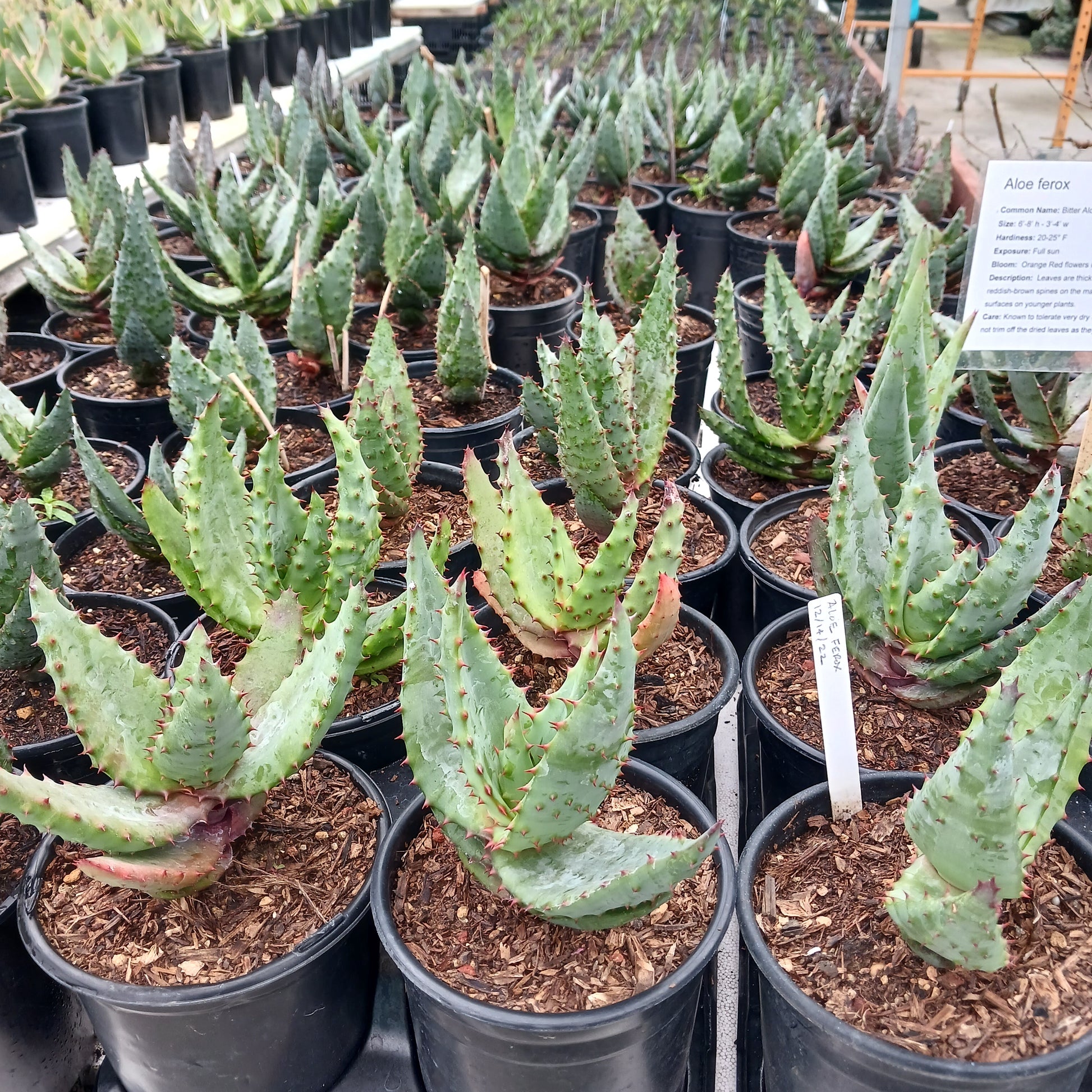 Aloe ferox, commonly known as Cape Aloe, Bitter Aloe, or Red Aloe, is a tall, solitary succulent native to South Africa and Lesotho. It features large rosettes of blue-green to gray-green leaves lined with reddish spines along the margins and often across both surfaces. Mature plants develop a single trunk over time, typically reaching 6 to 10 feet tall, sometimes taller, and may display a skirt of dried leaves around the base. From late fall to early spring, Aloe ferox produces tall, branched inflorescences with tubular flowers ranging in color from red and orange to yellow. These blooms are rich in nectar and attract a wide variety of wildlife, including birds, insects, and even monkeys in native habitats. The species thrives in full sun and well-draining soils and tolerates drought, though it benefits from occasional watering during the growing season. Endemic to dry slopes, karoo edges, and grassy fynbos across the Cape and Free State provinces, Aloe ferox is also valued for its historic medicinal use, especially for the bitter sap beneath its leaf skin. It is suitable for USDA Zones 9–11, with foliage tolerating brief frost and flowers sensitive around 24°F. In gardens, it makes a striking focal point, supports pollinators, and brings both ornamental and ethnobotanical value to xeric landscapes.