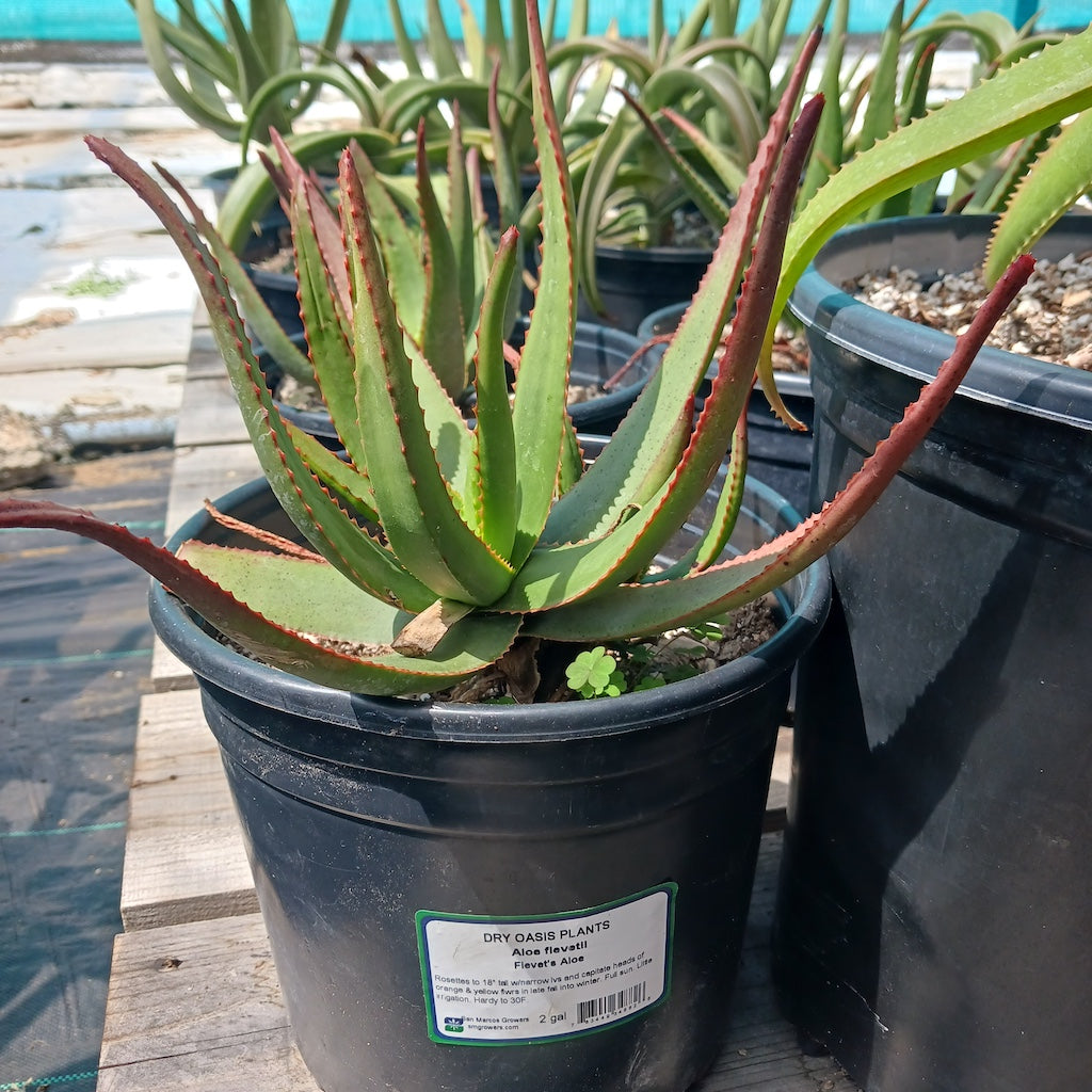 Aloe fievetii, commonly known as Fievet's Aloe, is an evergreen succulent originating from Madagascar. It forms a stemless or short-stemmed rosette of narrow lanceolate leaves, typically 12-16 inches long, with red-tinged green coloring. The leaves are erect then spreading, with dentate tips and reddish teeth. In late fall to mid-winter, it produces unbranched or once-branched inflorescences, rising nearly 2 feet tall above the leaves, bearing bicolored candy corn flowers with orange buds opening to display bright yellow flowers. This species originates from East-Central Madagascar, where it grows naturally on granite rocks at around 4,000 feet elevation. Named in 1965 to honor Mr. Gerard Fievet, its discoverer, Aloe fievetii prefers full sun and well-drained soil with occasional to very little irrigation. It is hardy down to the high 20°F, adding an exotic touch to gardens, particularly rock gardens, with its unique appearance and bicolored flowers.