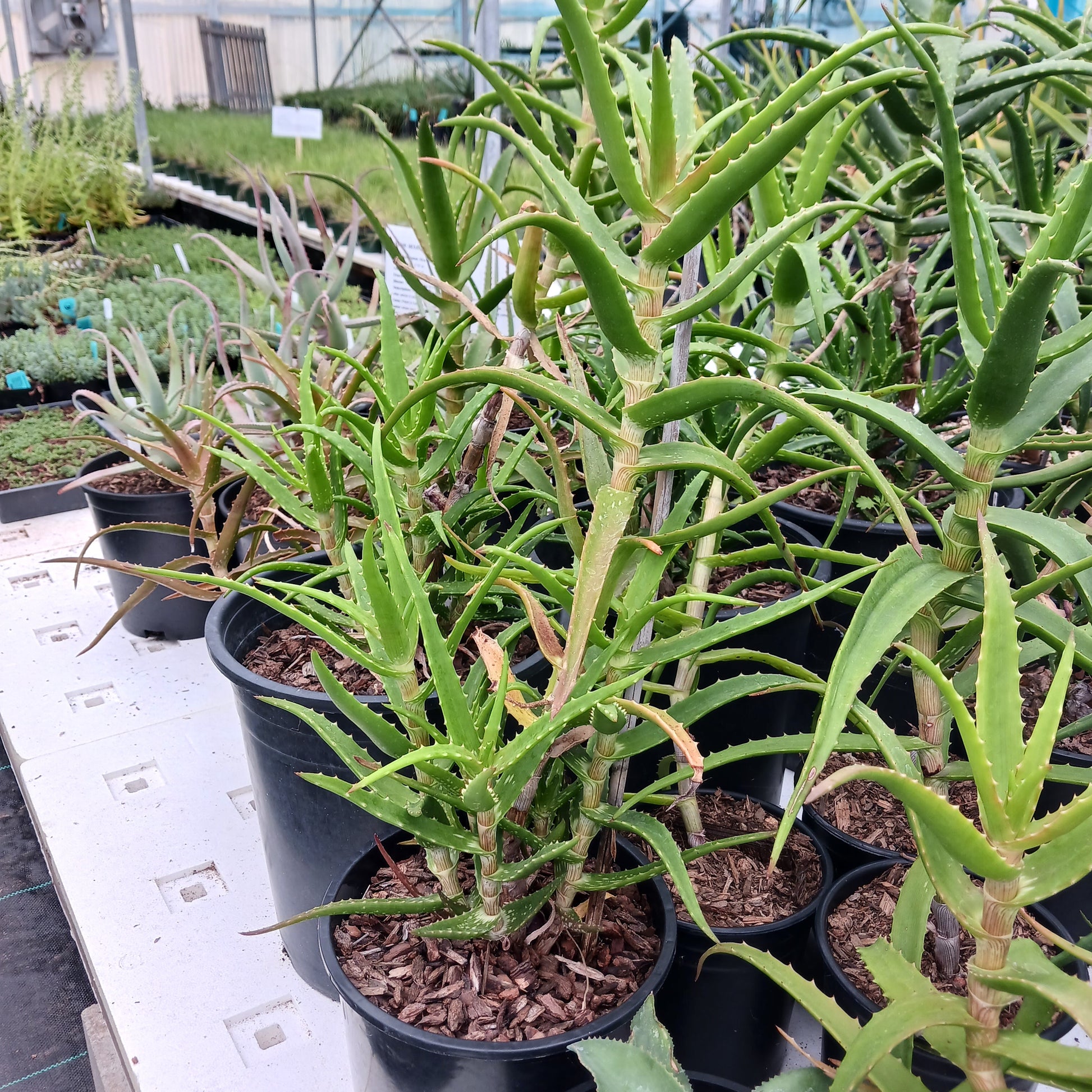A medium-large sized, Kenyan aloe with bright green, narrow, toothy, somewhat recurved leaves and multiple tall, thin stems. The Kenyan Aloe is a suckering, spreading shrub up to about six feet tall.