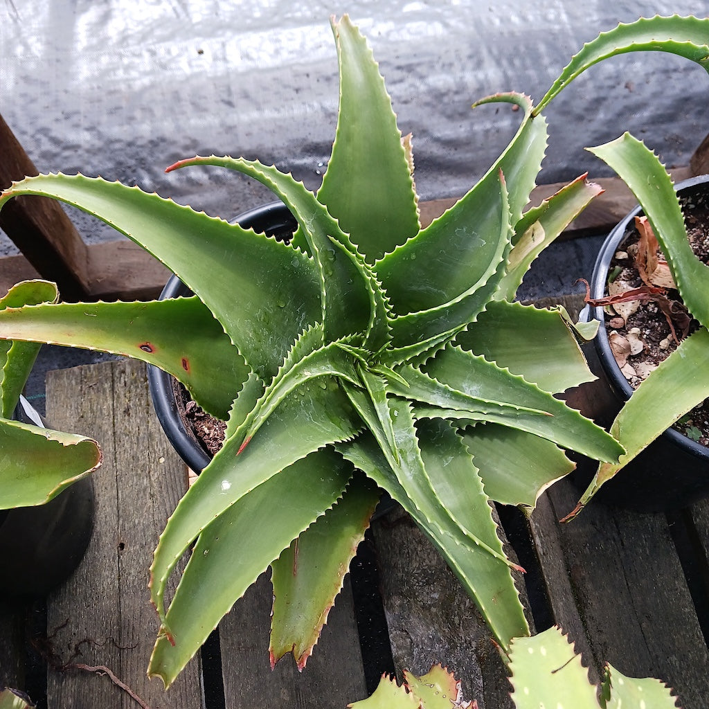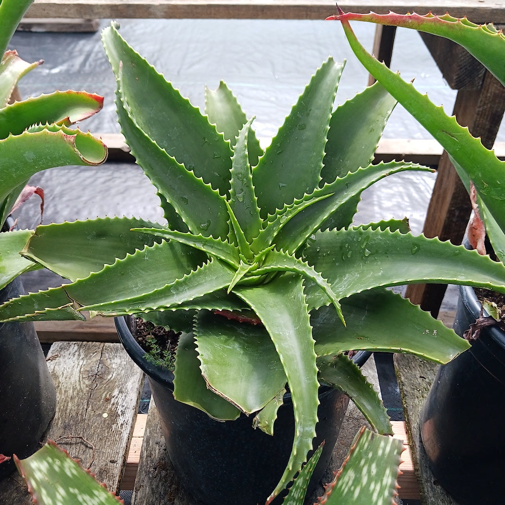 Also known as Luke's Aloe, boasts a striking solitary growth habit with a rosette spanning 3-4 feet wide. Its dark green leaves, measuring 2 feet long by 4 to 5 inches wide, feature large, evenly spaced light-colored teeth. This plant produces red to orange flowers in late summer, emerging from erect conical racemes atop a multi-branched inflorescence rising just above the foliage. While cultural information is limited due to its novelty in cultivation, it thrives in full to part sun with occasional to infrequent irrigation.