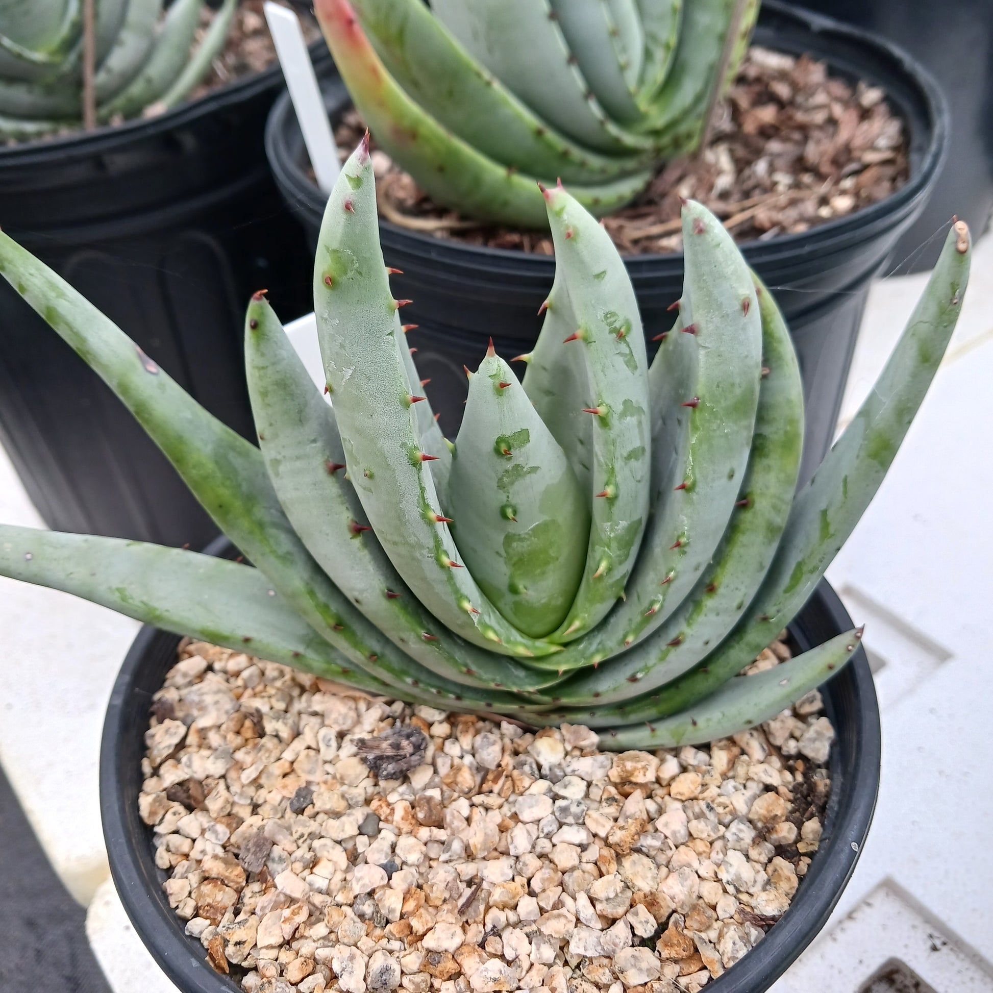 Aloe petricola is solitary, stemless, growing to 2 feet high and up to 3 feet wide which is native to South Africa. This Aloe has thick, stiff, non-bending pale blue-green leaves with sharp, widely spaced small reddish marginal teeth and an overall ball-like, rounded form.