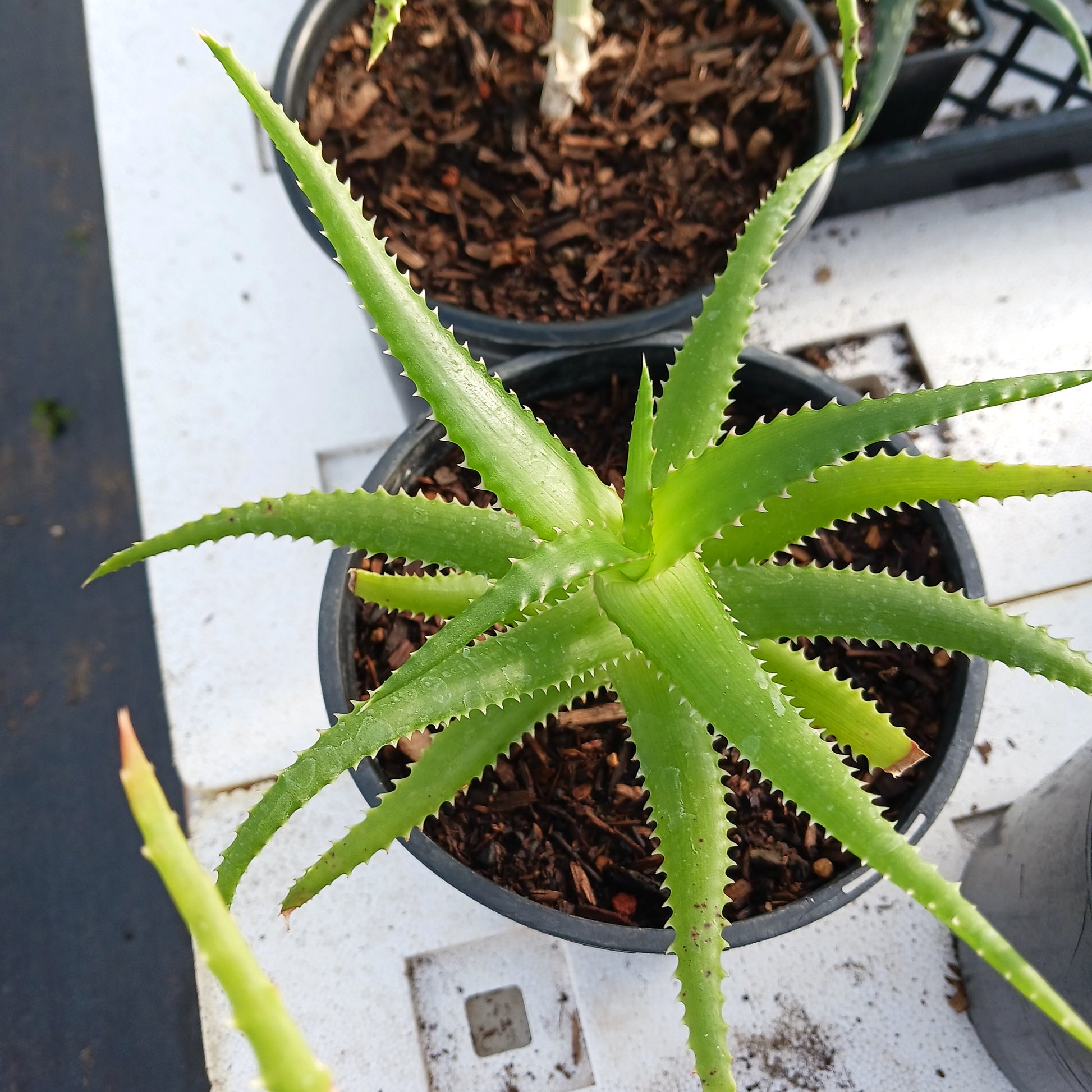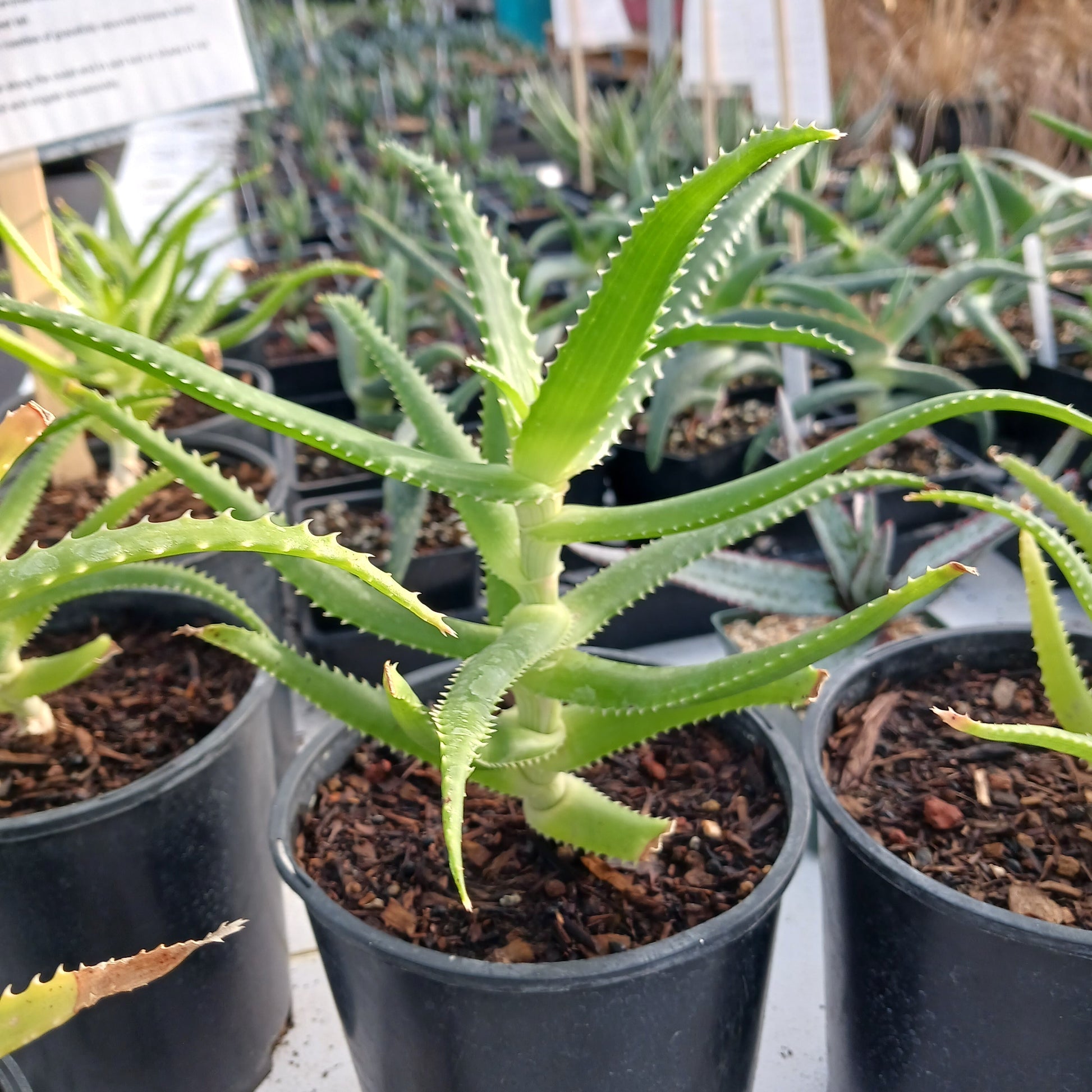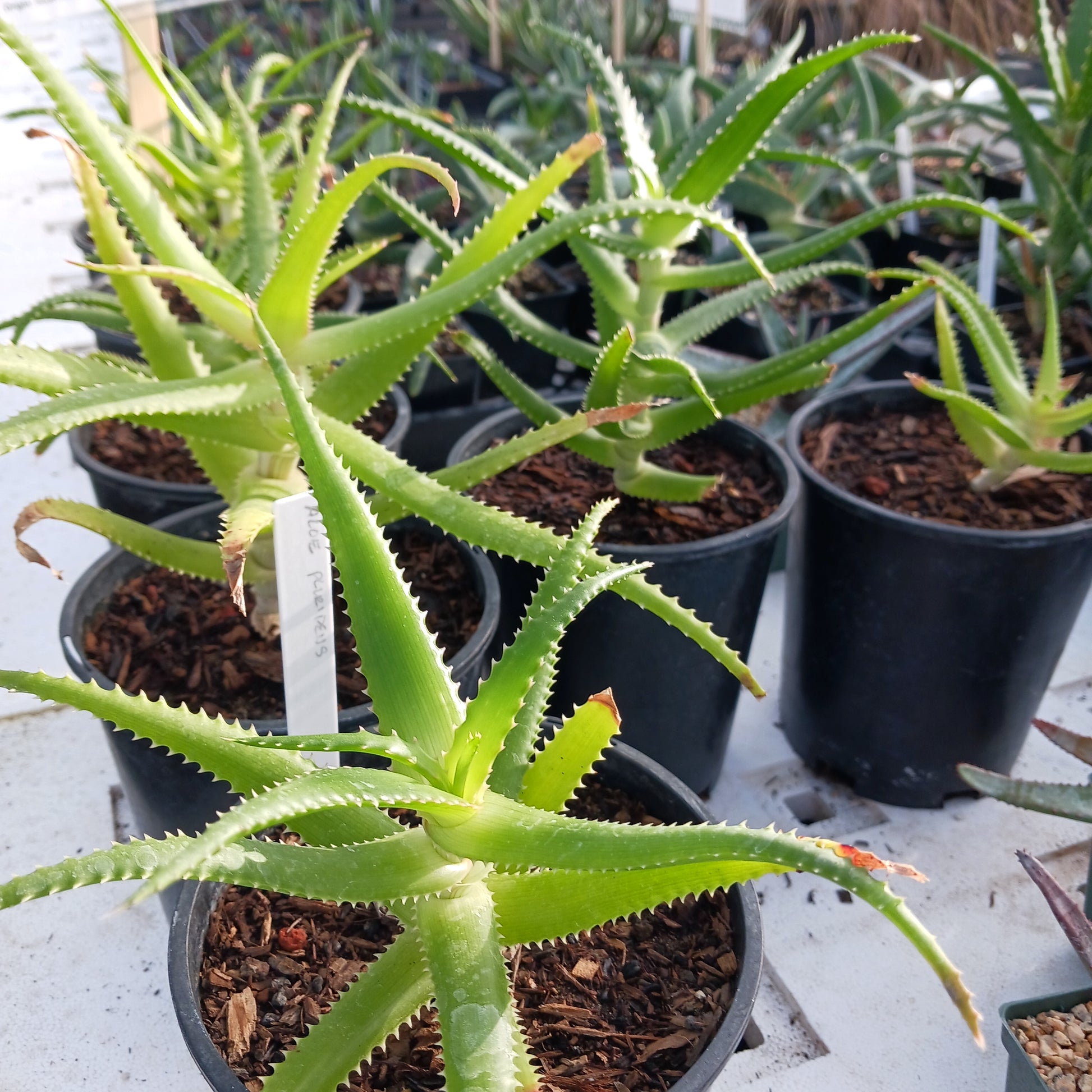 Aloe pluridens, also known as the French Aloe, is a graceful, slender tree aloe native to South Africa. It is an ideal plant for coastal gardens, usually reaching up to 15 feet and forming large, spiral-shaped rosettes. Its light-green leaves are thin and gently curved, forming a symmetrical pattern. The upper part of the stem displays the papery remains of the previous leaves, while the lower part becomes smooth and bare. It can be single-stemmed or produce multiple branches, and sometimes bear tiny plantlets. It has a similar silhouette to small palm trees, with long, thin stems and many leaves.