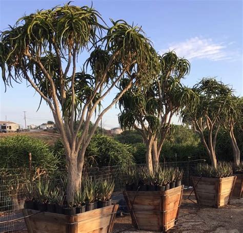 A medium-sized tree aloe reaching heights of over 9 feet. It features slender, pale green leaves that may turn orange in California's warmer months. Its flowering stem emerges in late fall to early winter, showcasing clusters of pale orange buds that bloom into salmon-colored flowers. This variety, technically a form of Aloe barberae, has been affectionately named 'Medusa' by enthusiasts due to its distinct branching pattern and unique flower color.