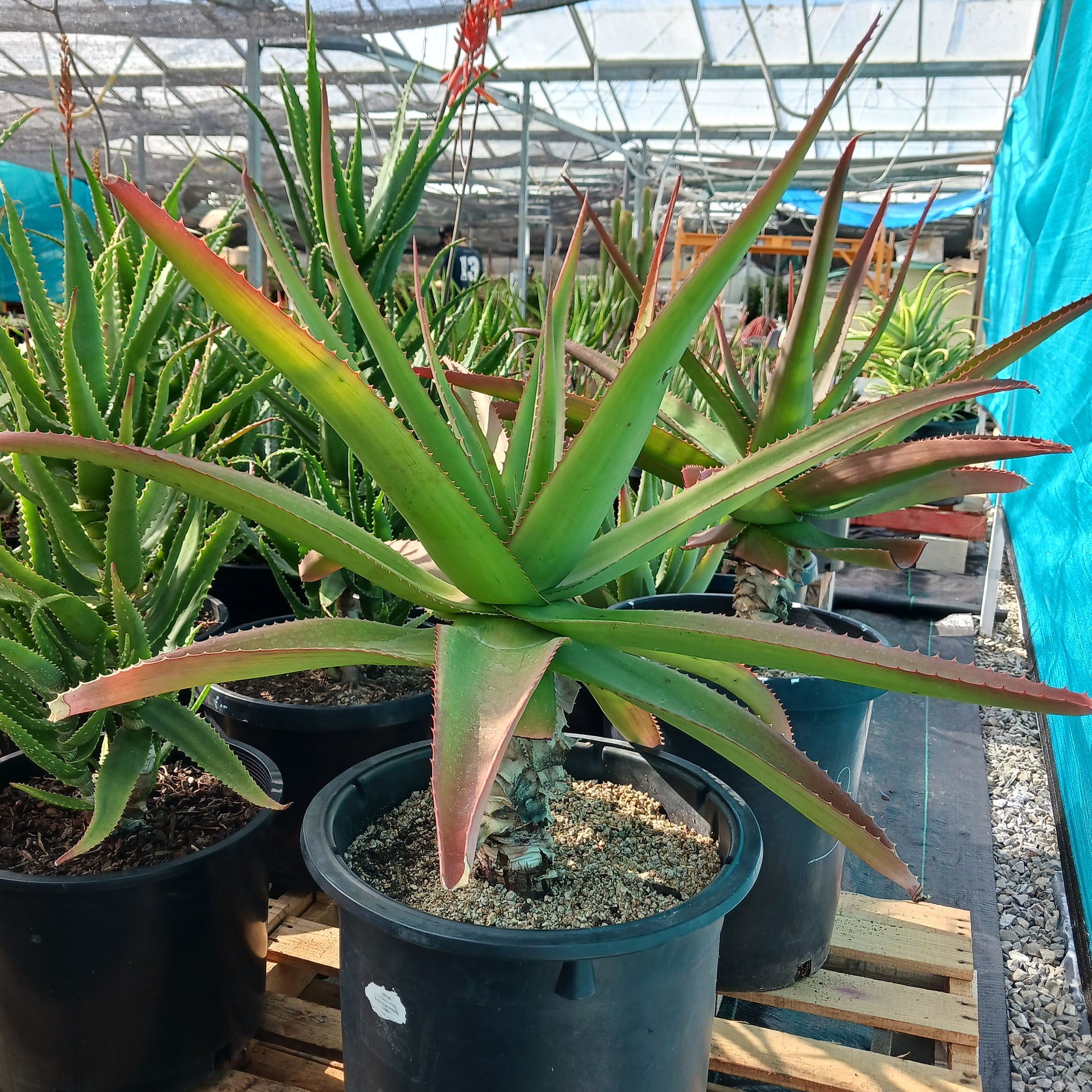 Aloe vaombe is a magnificent succulent tree that can grow up to 12 feet tall or more, with solitary rosettes of cupped-shaped leaves up to 5 feet across. These leaves are greyish-green in color, edged with white serrated 'teeth', and take on a beautiful red hue during winter. The showy, fiery red flowers sprout from erect, branched racemes in mid winter. This stunning Madagascan native is highly drought-tolerant, and does well in most climates and soils. Plant Aloe vaombe in full sun, and water sparingly once established; however, frequent irrigation encourages faster growth. In hot, inland areas, filtered light is beneficial. It can endure temperatures as low as 30F, but severe damage may be sustained below 26F.