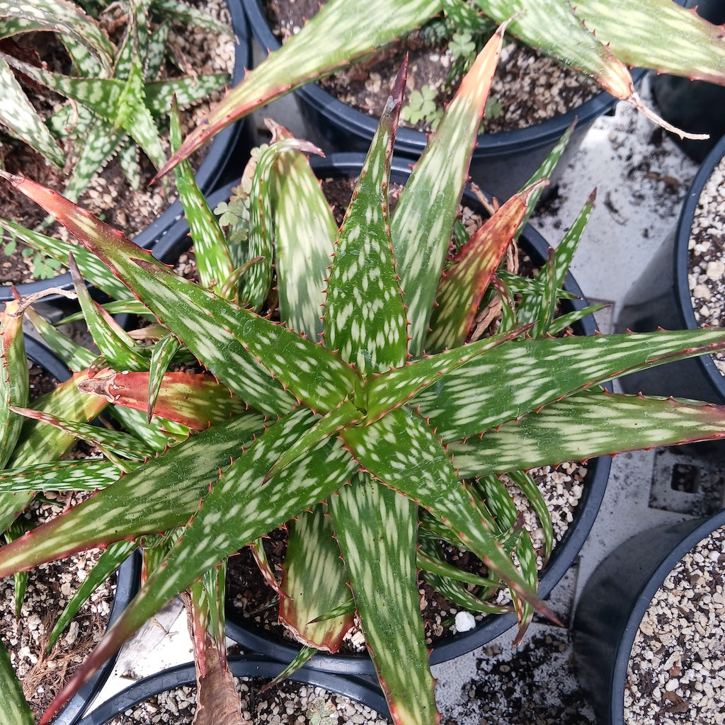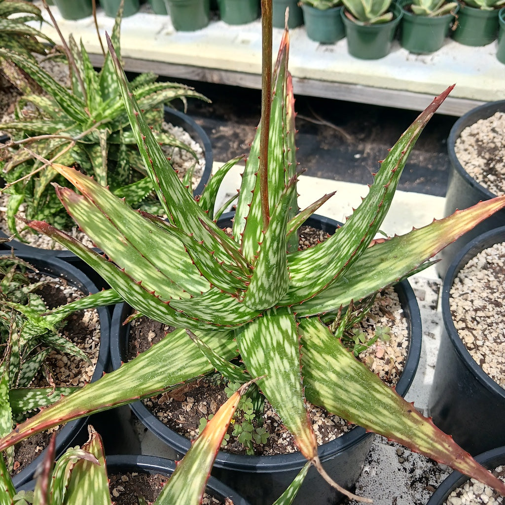 A compact clustering succulent, reaching 12-18 inches tall. Its lance-shaped green leaves feature decorative zigzagging horizontal bands of spots, reddish-brown toothed margins, and red highlights in full sun. It produces bright yellow flowers on 2-foot tall branched inflorescences throughout the year. Hardy to temperatures as low as 25°F, it thrives in well-drained soil in full sun to light shade. Developed from a cross between Aloe sinkatana and Aloe peckii, this cultivar, named to honor its breeder, boasts year-round attractiveness with its spotted foliage.