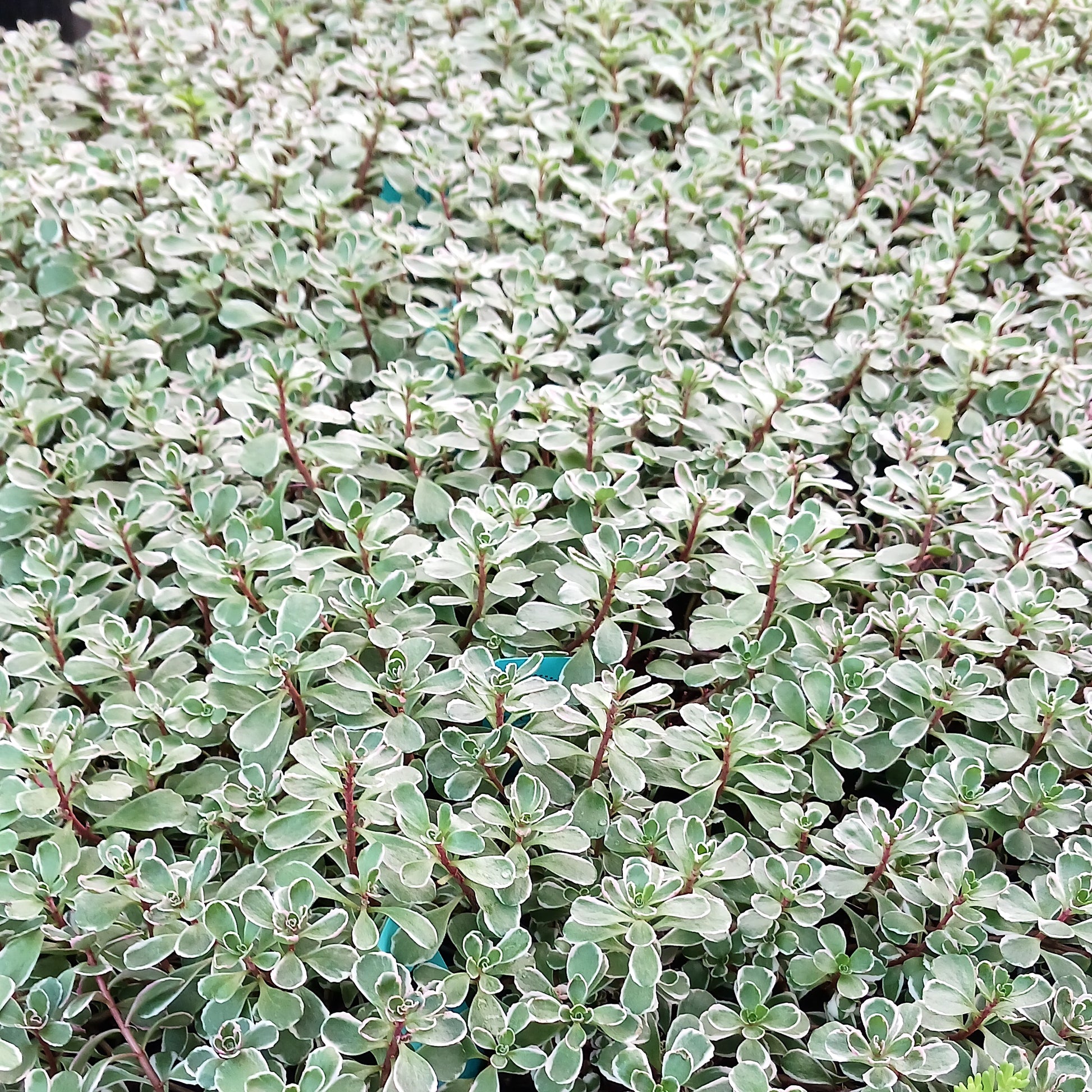 This tricolor Stonecrop is an evergreen perennial. Drought, deer, fire, coast and shade tolerant. Good ground cover, container, rock garden and border plant with tricolored foliage of cream, green and bright pink. Attracts butterflies. Pink summer blooms. Height: 2"-6". Moderate to minimal water needs. Tolerates full sun to part shade.